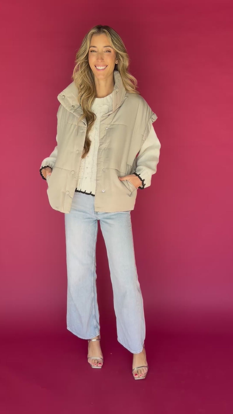 Light gray puffer vest with front zipper, side pockets, and drawstring hem.