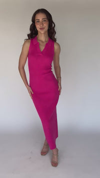 Pink ribbed bodycon maxi dress with back slit and collar.